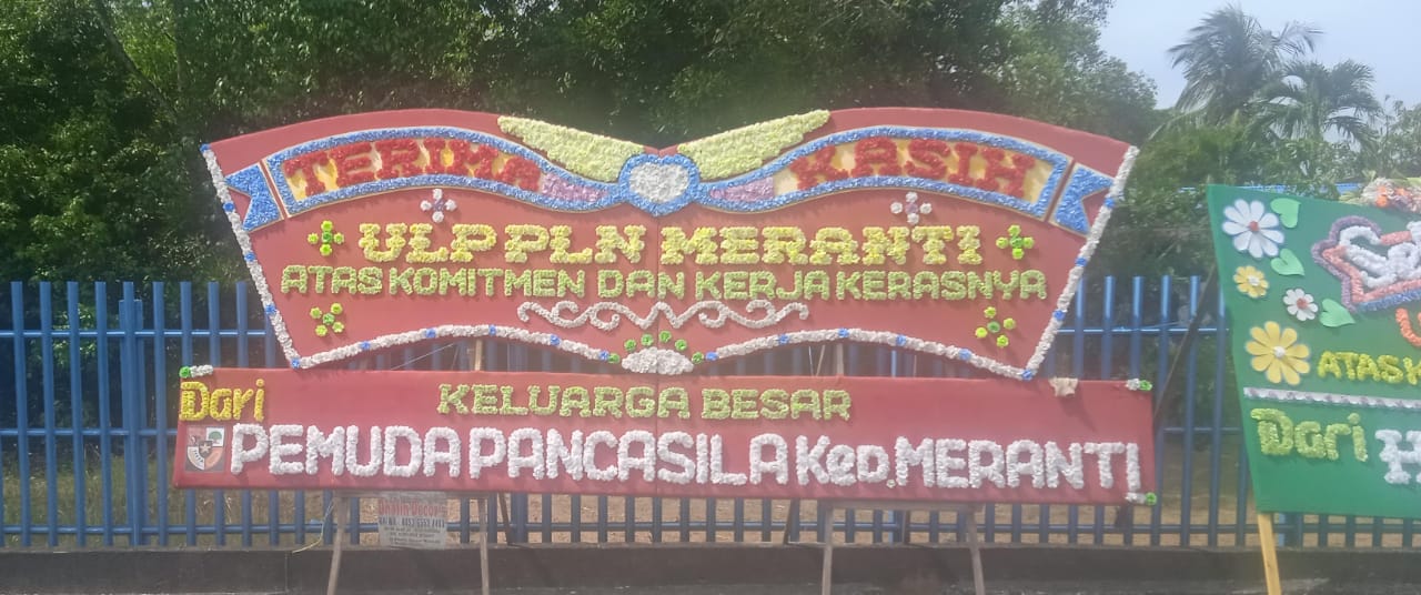 Papan Bunga yang Berisi Ucapan dari MPC Pemuda Pancasila Kepulauan Meranti yang bertulis ” Terima Kasih ULP PLN kepulauan Meranti Atas Komitmen dan Kerja Kerasnya “ sebagai motivasi agar ULP PLN Selatpanjang Terus meningkatkan kinerja dan kualitas pelayanan terhadap masyarakat .